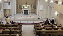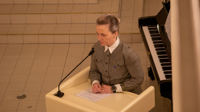 ![]() Sotilapoikakuoro ja orkesteri | ![]() Puheenjohtaja Merja Nieminen piti avauspuheen. |