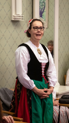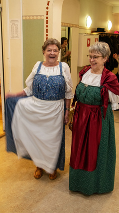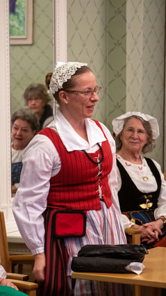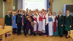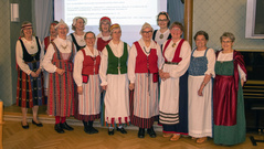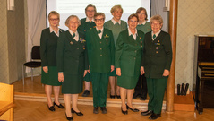23.4. ti Perinteinen lottailta Tuulensuojassa.Sää oli lähes yhtä huono kuin edellispäivänäkin. Toiveena oli, että ”tuulettaisimme” kansallis-, sotilaskoti-, lotta-, ja Martta-pukuja ja vastaavia, joita asuja harvemmin voi käyttää. Sää ei säikyttänyt reippaita iltaan osallistujia. Yhdistyksemme tarjosi lottaleivoskahvit 51 osallistujalle, ja illan esitelmöitsijä tohtori Maritta Pohls kertoi presidentinpuoliso Ellen Svinhufvudin monipuolisesta ja mielenkiintoisesta elämästä. Saimme lopuksi ihailla kauniita osallistujien kansallispukuja, joita oli eri puolilta Suomea. Tuuterinpuku, Alavuden puku, Anjalan puku, Koiviston puku, Sääksmäen juhlapuku, Pyhäjärven puku, Kymenlaakson vanha ja uusi puku, ja Pyhäjärven puku olivat ainakin illassa. Lukuisia sotilaskotipukuja, Martta-pukuja ja lottapukuja, sekä pari Feresiä täydensivät värikästä iltaamme. Valokuvaajamme Seppo Liimatainen ikuisti osallistujat yhteiskuvaan. |