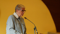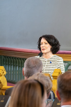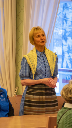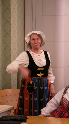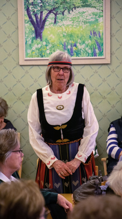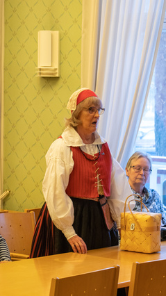 ![]() Kaija Vesala esittelee Aila Salon suunnitteleman Suomen Lottaperinneliiton puheenjohtajan käädyn tarinan. | ![]() |