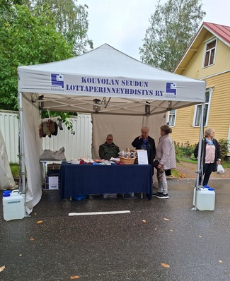 Wanhan ajan markkinat Kouvolan Museokorttelissa 11.9.2023. Kouvolassa vietettiin 25. kerran Wanhan ajan markkinoita ja Kouvolan Seudun Lottaperinneyhdistys oli myös mukana. Myytävänä meillä oli Lottanukkekerhon jäsenten tekemiä käsitöitä, mm. lottalapasia ja -sukkia, lottanukkeja ja kaulureita. Talvisodan leipää olimme varanneet myytäväksi 60 kpl ja ne myytiin loppuun jo ennen puoltapäivää. Ilma suosi markkinoita ja lottaperinteen teltalla kävi runsaasti asiakkaita. |