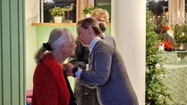 Yhdistyksen puheenjohtaja Merja Nieminen kävi luovuttamassa mitalit henkilöille. |