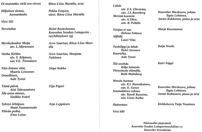 ![]() Sirpa Kokko esitti runoja. ”Ystävyyttä”, Sinikka Svärd ”Niin iloinen siitä”, Maaria Leinonen | ![]() Kaija Vesala esitti runoja. ”Nocturne”; Eino Leino ”Minun Isänmaani”, Raili Malmberg |