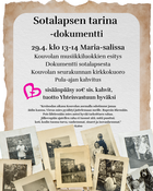 Tilaisuudessa esitetään Liisa Tuomisen ja Raimo Sävilän tekemä dokumentti Sotalapsen tarina. Tilaisuudessa on mukana Suomen Lottaperinneliiton puheenjohtaja Merja Nieminen. Pääsylippu 10 € sisältää kahvin. TERVETULOA!